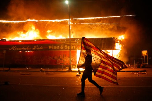 A protester carries the carries a U.S. flag upside, a sign of distress, next to a burning building Thursday, May 28, 2020, in Minneapolis. Protests over the death of George Floyd, a black man who died in police custody Monday, broke out in Minneapolis for a third straight night. (AP Photo/Julio Cortez)