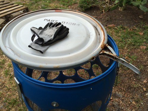 The other part of the sifter is where will the waste go and how will I move it. To solve that I had the barrel set at an angle to dump waste into a wheelbarrow. The barrel rest on two casters affixed to a scrap of pallet spring clamped onto the wheelbarrow with a cardboard scrap underneath it to keep out processed compost. The spring clamps seem to provide enough holding power yet will give away if there is any real stress applied. I’m hoping that if there is some type of problem it will pop apart and not damage anything. On one end of the pallet scrap I have a hole drilled to hold one of those green garden stakes sold at local nursery’s. That holds a piece of cardboard which acts as a deflector to keep the unprocessed materials out of the processed materials.